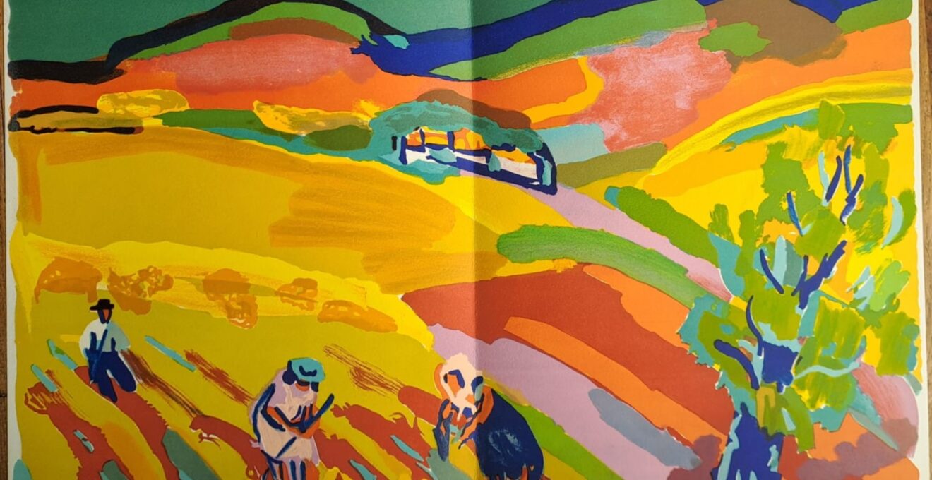 « Travail des champs » est une lithographie originale de Pierre Ambrogiani. On y retrouve la Provence, la chaleur du jour, des silhouettes au travail et une composition claire. La scène est simple, lisible, avec des masses de couleur qui structurent l’image et donnent du rythme.